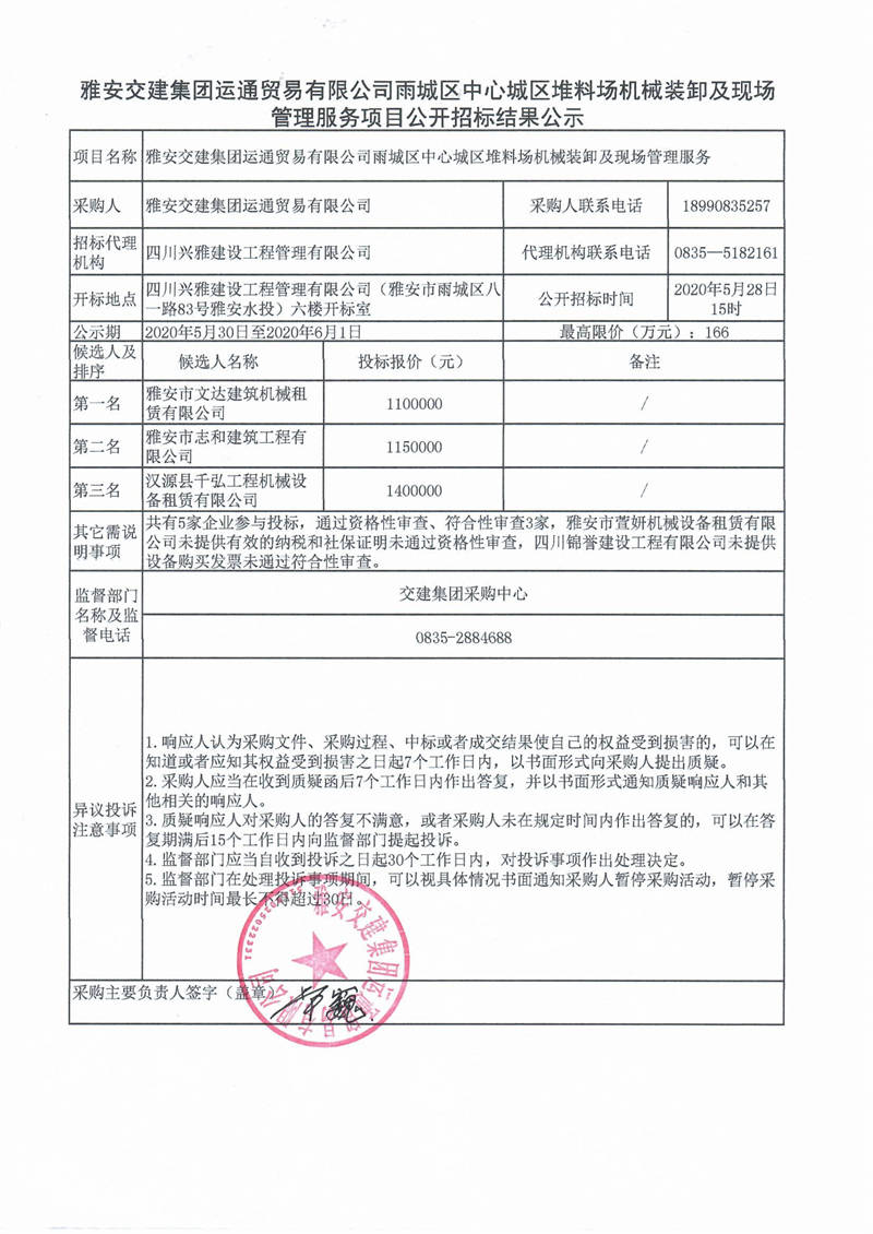 雅安交建集團(tuán)運(yùn)通貿(mào)易有限公司雨城區(qū)中心城區(qū)堆料場(chǎng)機(jī)械裝卸及現(xiàn)場(chǎng)管理服務(wù)項(xiàng)目公開招標(biāo)結(jié)果公示