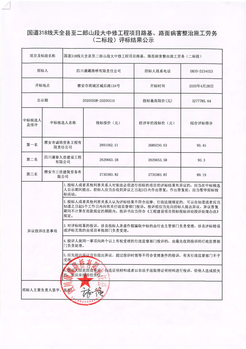 四川康藏路橋有限責(zé)任公司國道318線天全縣至二郎山段大中修工程項目路基、路面病害整治施工勞務(wù)(二標段)評標結(jié)果公示