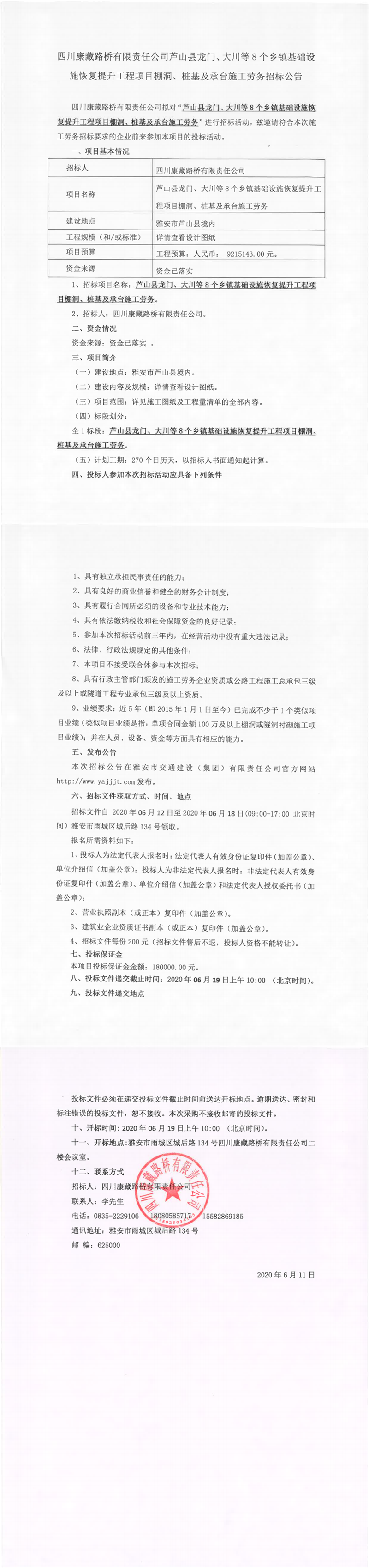 四川康藏路橋有限責(zé)任公司蘆山縣龍門、大川等8個鄉(xiāng)鎮(zhèn)基礎(chǔ)設(shè)施恢復(fù)提升工程項目棚洞、樁基及承臺施工勞務(wù)招標(biāo)公告