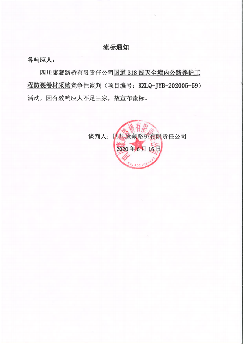 四川康藏路橋有限責(zé)任公司國(guó)道318線天全境內(nèi)公路養(yǎng)護(hù)工程防裂卷材采購流標(biāo)通知