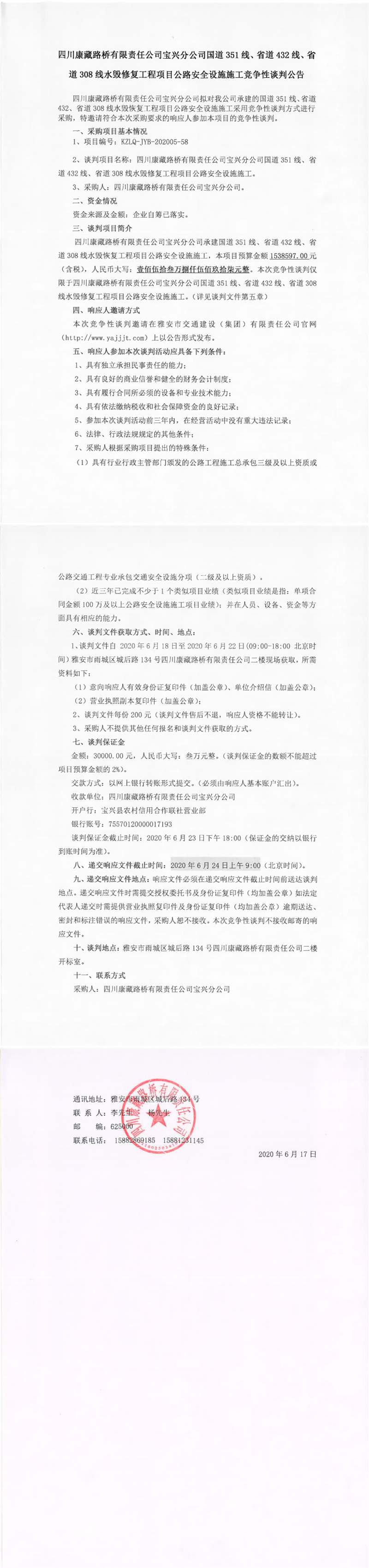 四川康藏路橋有限責(zé)任公司寶興分公司國道351線、省道432線、省道308線水毀修復(fù)工程項目公路安全設(shè)施施工競爭性談判公告