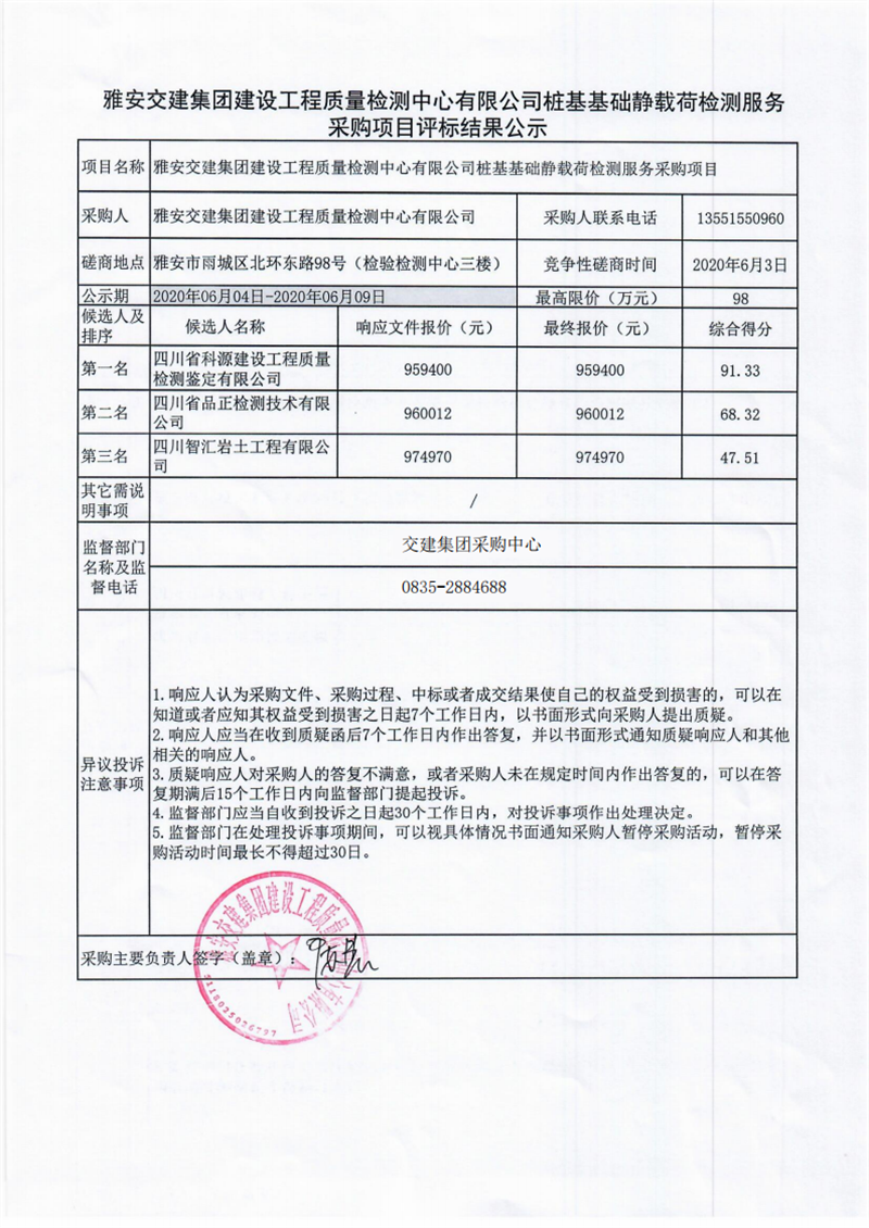 雅安交建集團建設工程質(zhì)量檢測中心有限公司樁基基礎靜載荷檢測服務采購項目評標結(jié)果公示