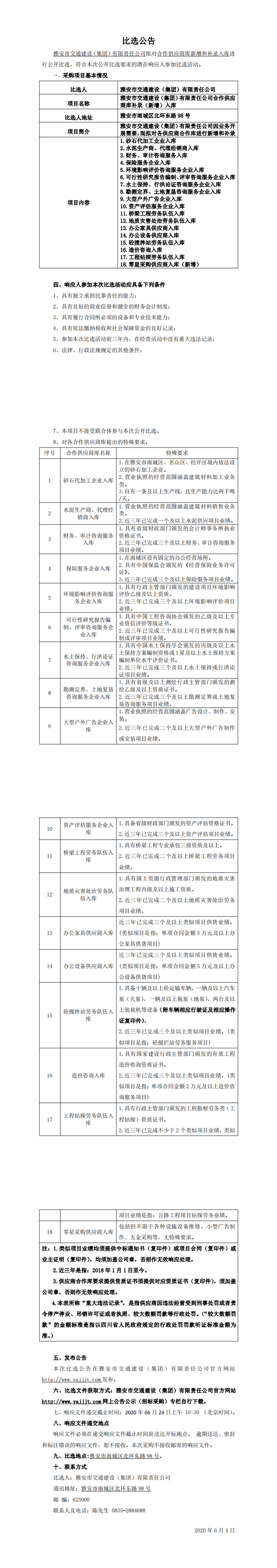 雅安市交通建設(shè)(集團(tuán))有限責(zé)任公司合作供應(yīng)商庫(kù)補(bǔ)錄(新增)入庫(kù)比選公告