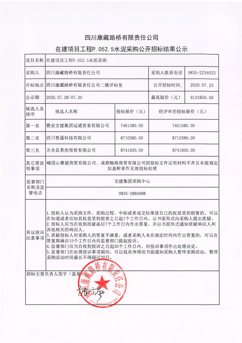 四川康藏路橋有限責(zé)任公司在建項目工程P.052.5水泥采購公開招標(biāo)結(jié)果公示