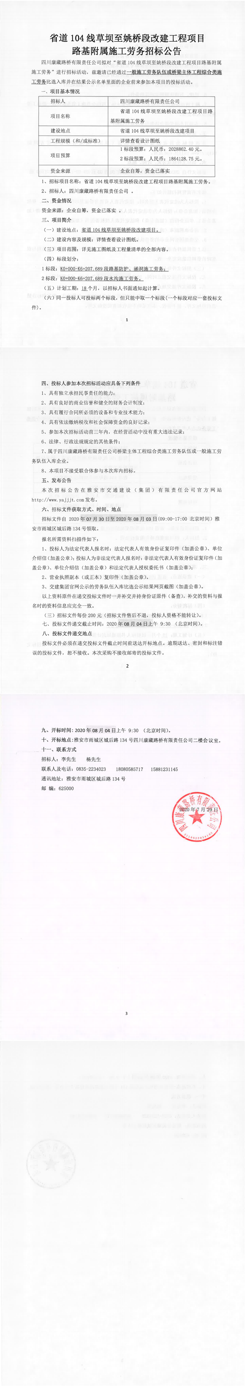 四川康藏路橋有限責(zé)任公司省道104線草壩至姚橋段改建工程項(xiàng)目路基附屬施工勞務(wù)招標(biāo)公告