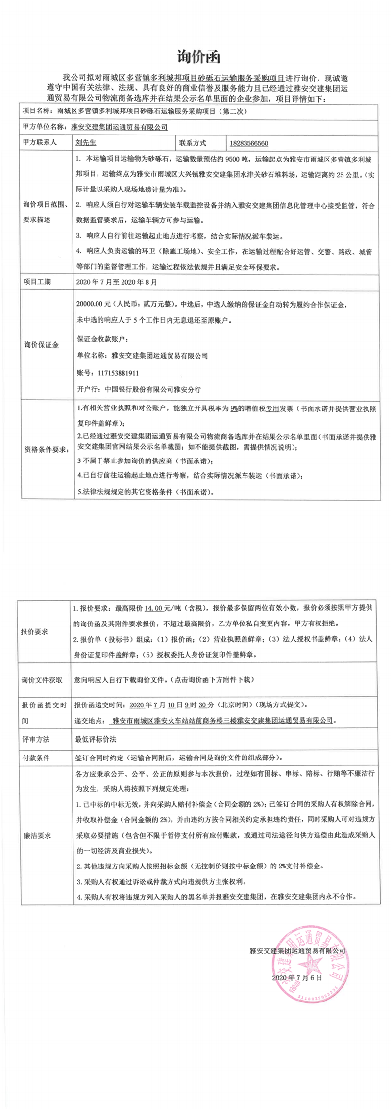 雅安交建集團運通貿易有限公司雨城區(qū)多營鎮(zhèn)多利城邦項目砂礫石運輸服務采購項目(第二次)詢價函