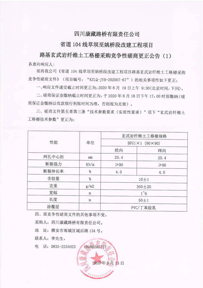 四川康藏路橋有限責(zé)任公司省道104線草壩至姚橋段改建工程項(xiàng)目路基玄武巖纖維土工格柵采購(gòu)競(jìng)爭(zhēng)性磋商更正公告(1)
