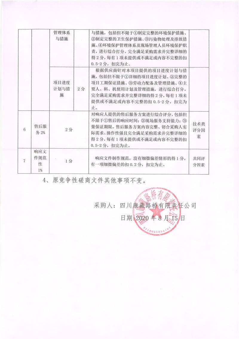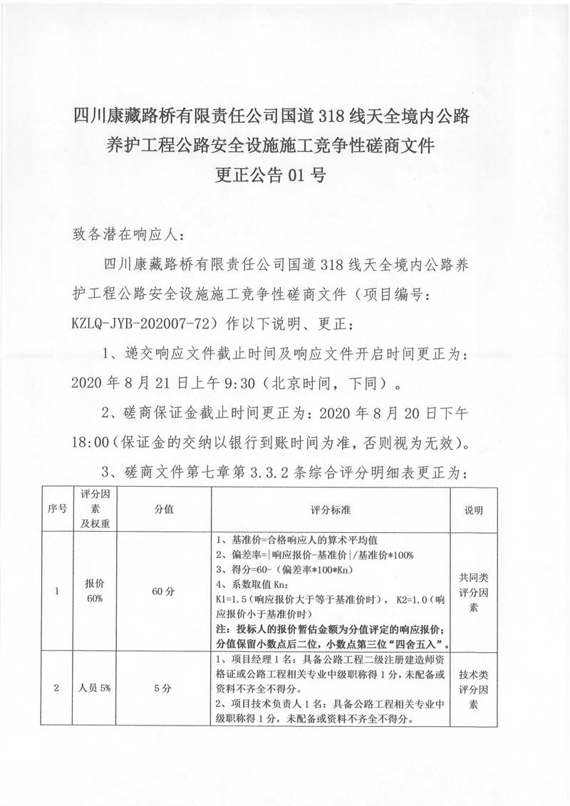 四川康藏路橋有限責(zé)任公司國道318線天全境內(nèi)公路養(yǎng)護(hù)工程公路安全設(shè)施施工競(jìng)爭(zhēng)性磋商文件更正公告01號(hào)