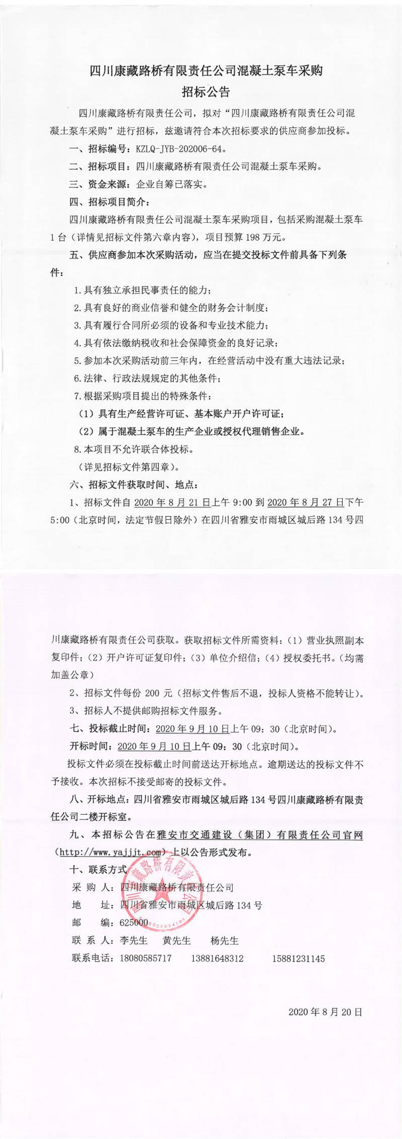 四川康藏路橋有限責任公司混凝土泵車采購招標公告