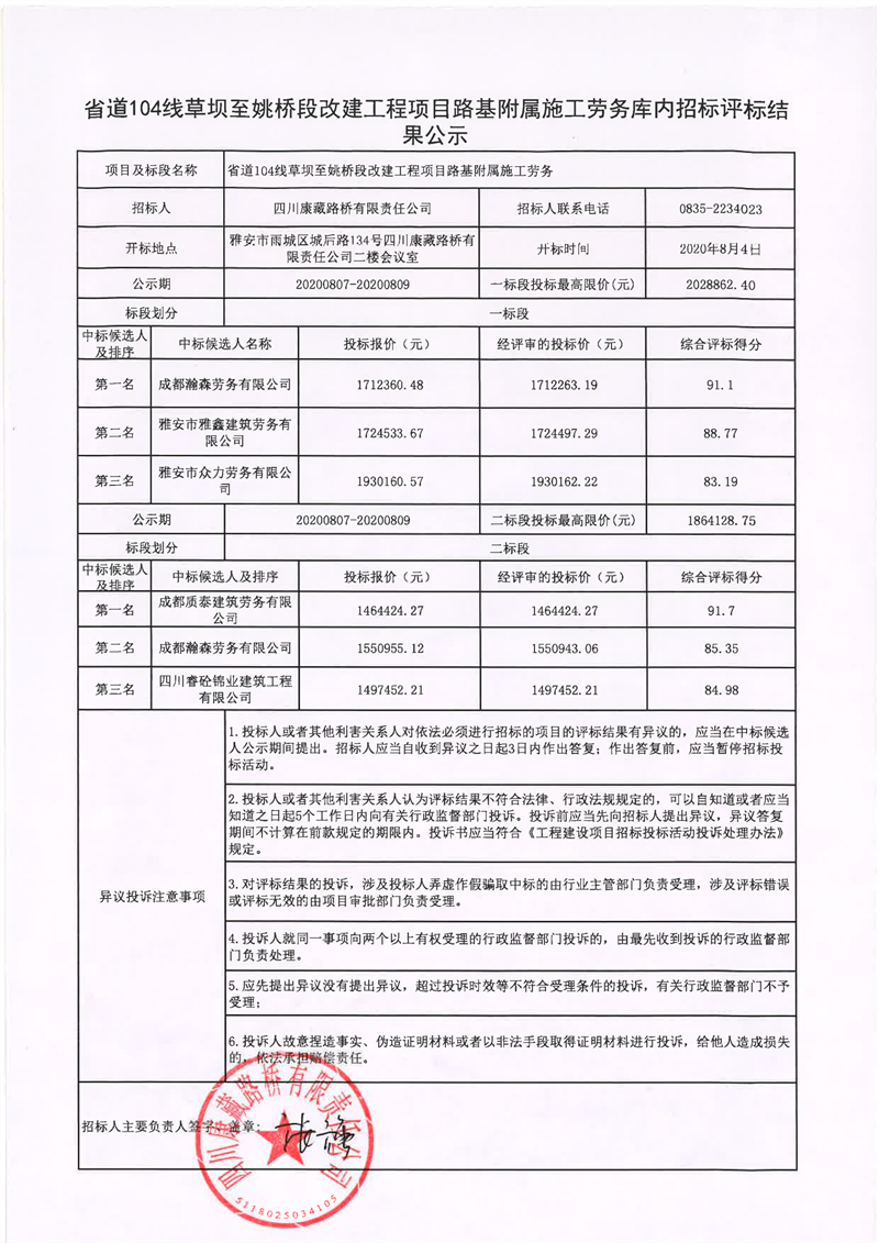 四川康藏路橋有限責(zé)任公司省道104線草壩至姚橋段改建工程項(xiàng)目路基附屬施工勞務(wù)庫內(nèi)招標(biāo)評標(biāo)結(jié)果公示