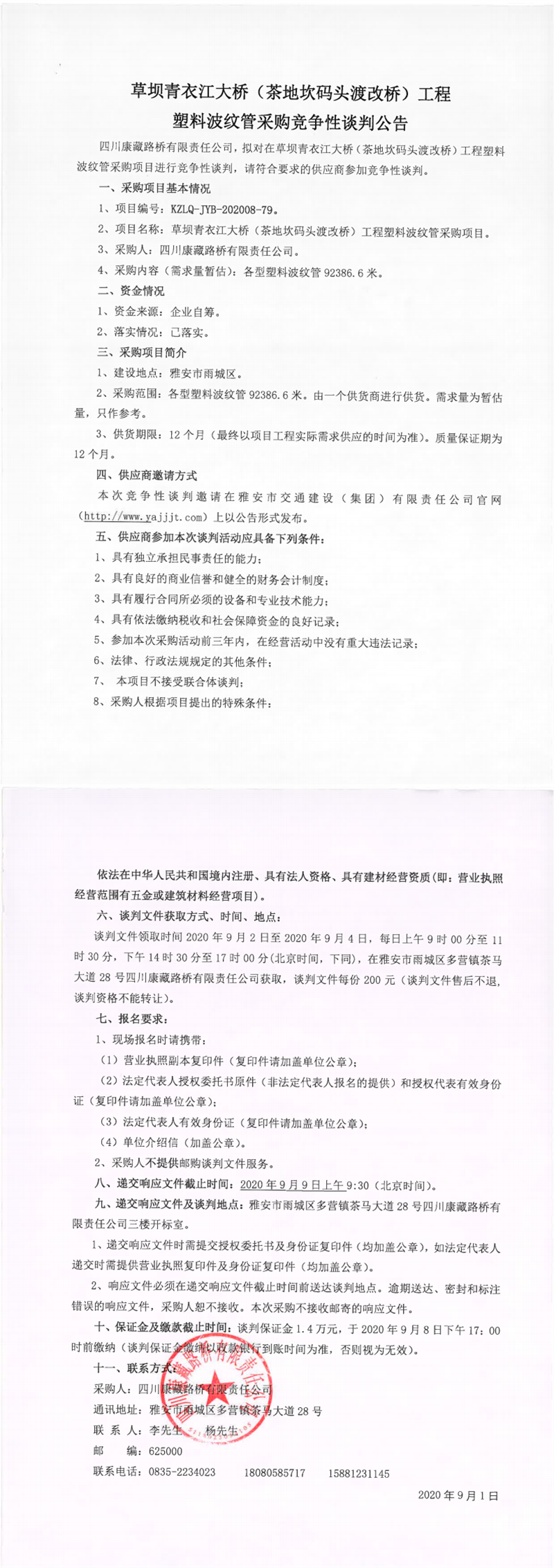 四川康藏路橋有限責任公司草壩青衣江大橋(茶地坎碼頭渡改橋)工程塑料波紋管采購競爭性談判公告