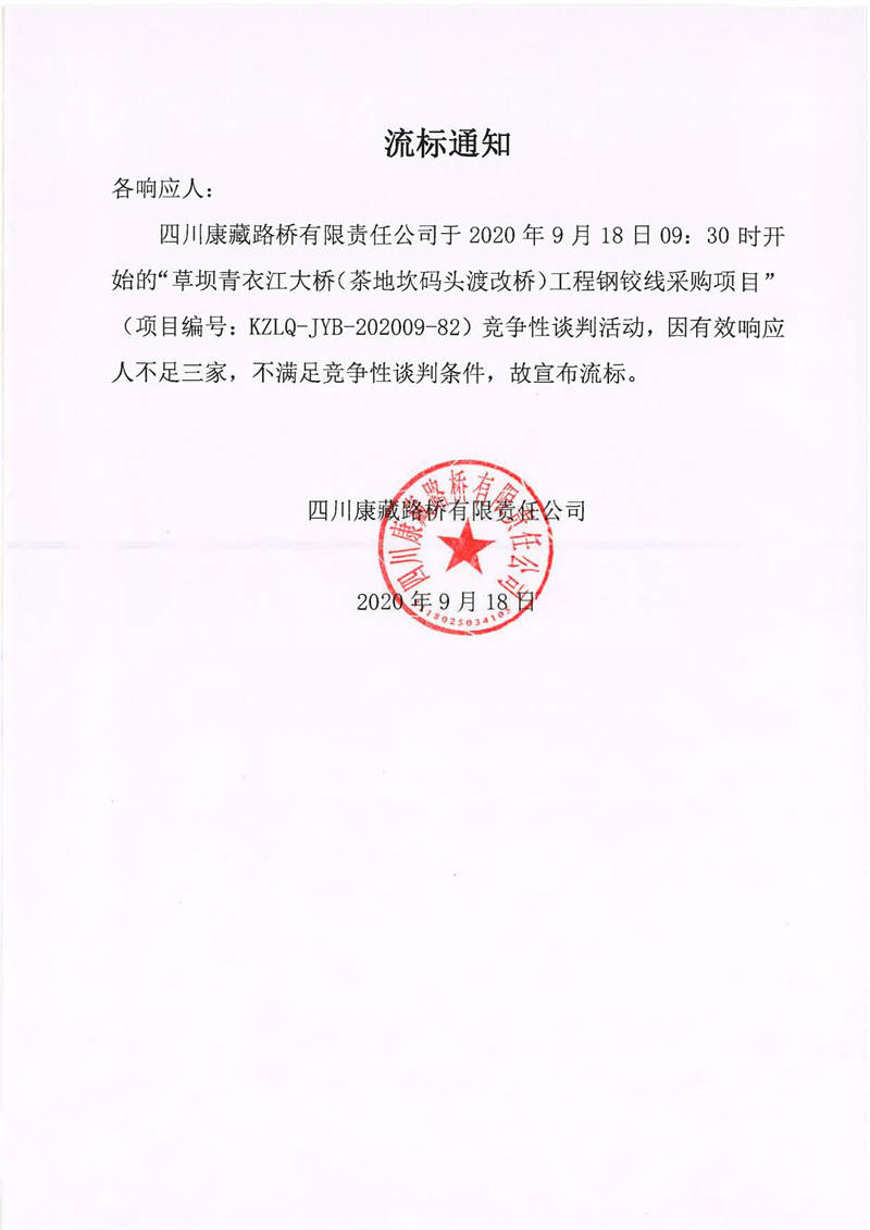 四川康藏路橋有限責(zé)任公司草壩青衣江大橋(茶地坎碼頭渡改橋)工程鋼鉸線采購項目流標通知