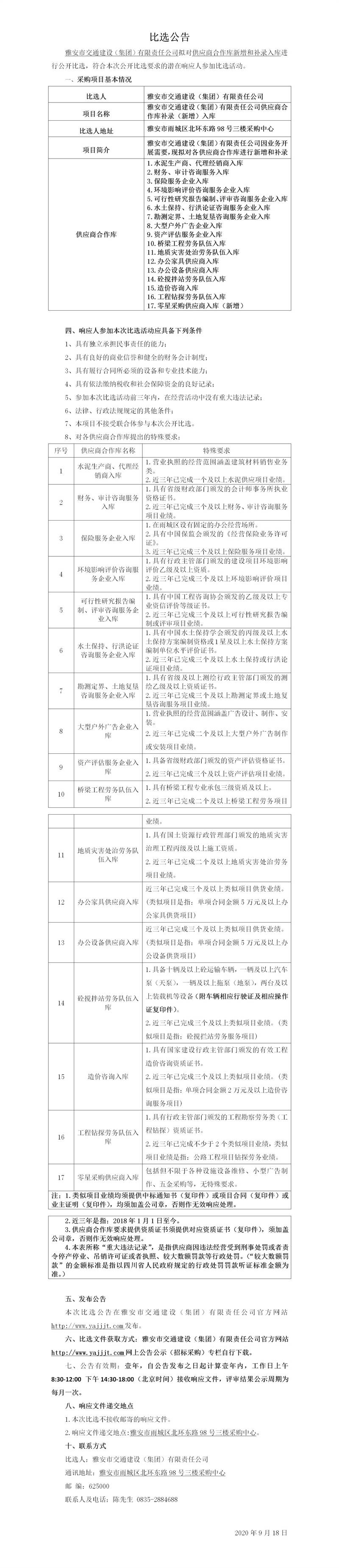 雅安市交通建設(shè)(集團(tuán))有限責(zé)任公司供應(yīng)商合作庫補(bǔ)錄(新增)入庫比選公告
