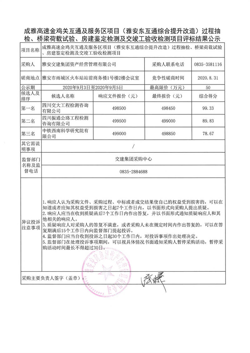雅安交建集團(tuán)資產(chǎn)經(jīng)營管理有限公司成雅高速金雞關(guān)互通及服務(wù)區(qū)項(xiàng)目(雅安東互通綜合提升改造)過程抽檢、橋梁荷載試驗(yàn)、房建鑒定檢測及交竣工驗(yàn)收檢測項(xiàng)目評標(biāo)結(jié)果公示