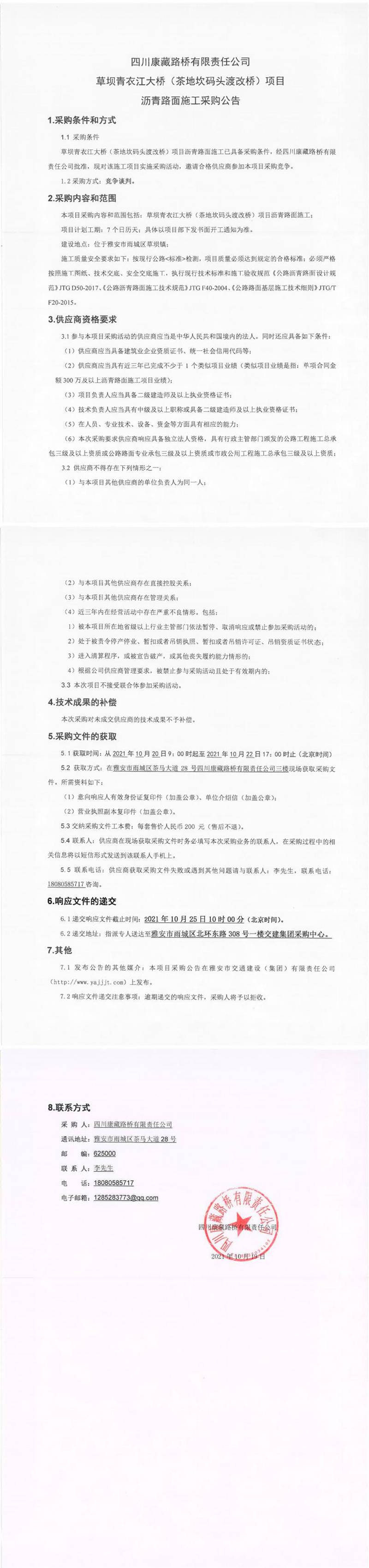 四川康藏路橋有限責(zé)任公司草壩青衣江大橋(茶地坎碼頭渡改橋)項(xiàng)目瀝青路面施工采購(gòu)公告