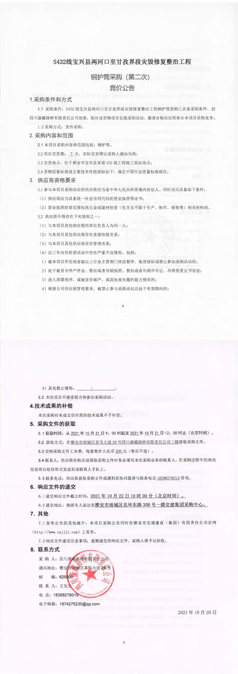 四川康藏路橋有限責任公司S432線寶興縣兩河口至甘孜界段災(zāi)毀修復(fù)整治工程鋼護筒采購(第二次)競價公告