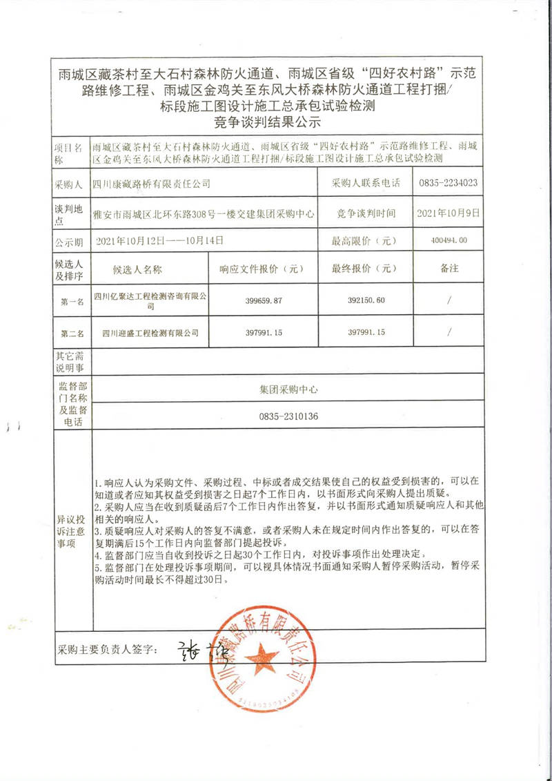 四川康藏路橋有限責任公司雨城區(qū)藏茶村至大石村森林防火通道、雨城區(qū)省級“四好農(nóng)村路”示范路維修工程、雨城區(qū)金雞關至東風大橋森林防火通道工程打捆/標段施工圖設計施工總承包試驗檢測競爭談判結果公示