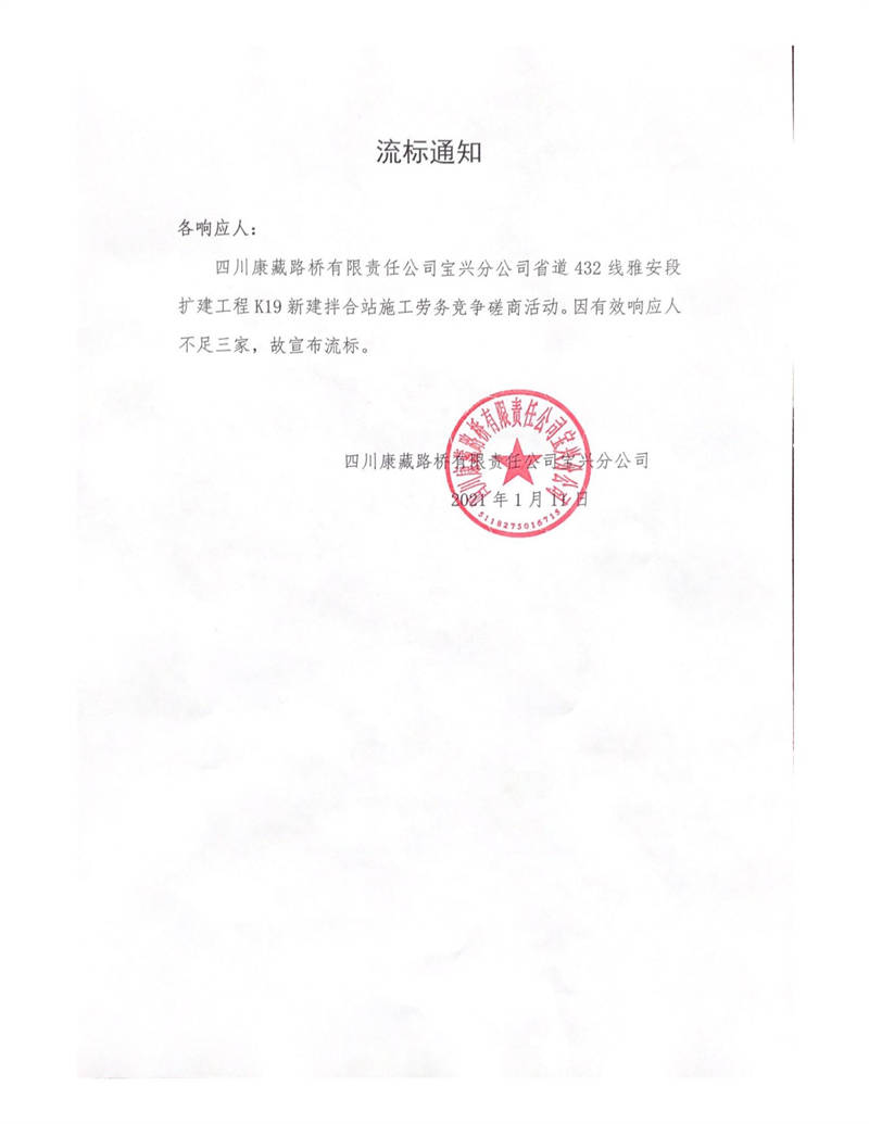 四川康藏路橋有限責(zé)任公司寶興分公司省道432線雅安段擴(kuò)建工程K19新建拌合站施工勞務(wù)競爭磋商流標(biāo)通知