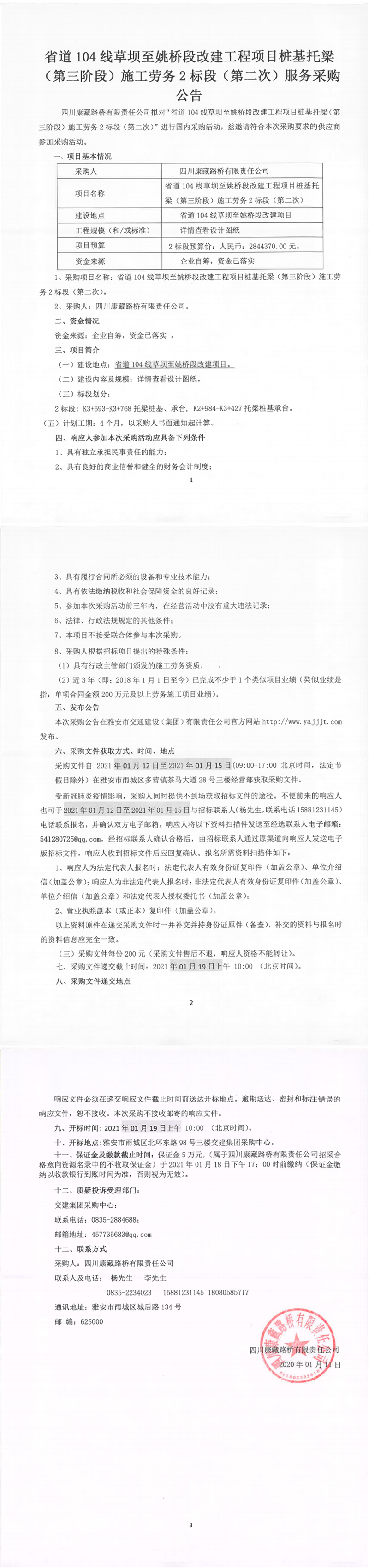 四川康藏路橋有限公司省道104線草壩至姚橋段改建工程項(xiàng)目樁基托梁(第三階段)施工勞務(wù)2標(biāo)段(第二次)服務(wù)采購(gòu)公告