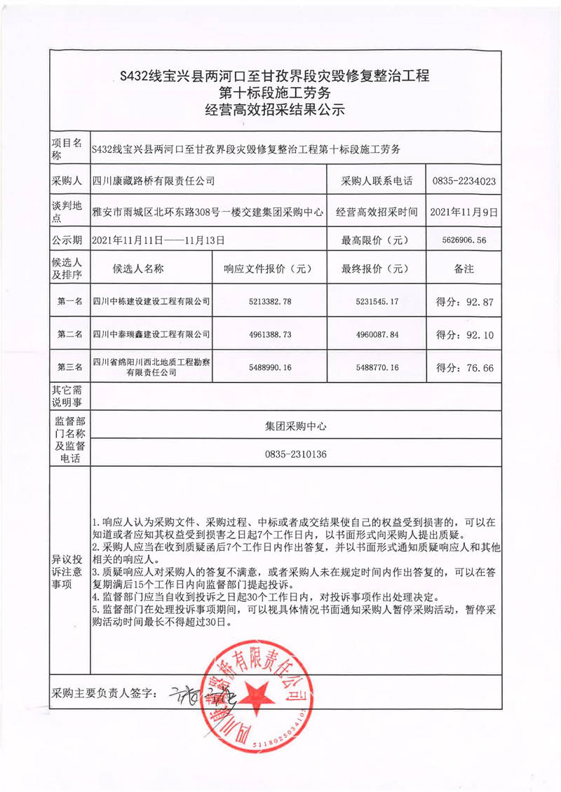 四川康藏路橋有限責任公司S432線寶興縣兩河口至甘孜界段災毀修復整治工程第十標段施工勞務(wù)經(jīng)營高效招采結(jié)果公示