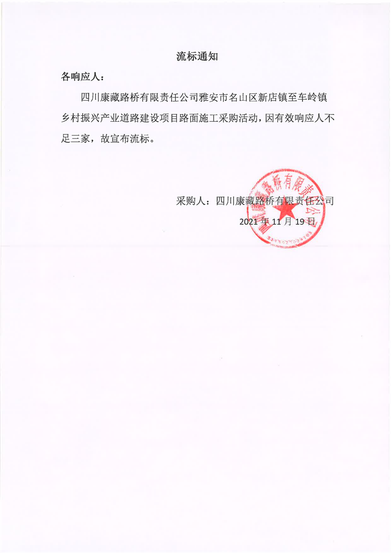 四川康藏路橋有限責(zé)任公司雅安市名山區(qū)新店鎮(zhèn)至車嶺鎮(zhèn)鄉(xiāng)村振興產(chǎn)業(yè)道路建設(shè)項(xiàng)目路面施工采購流標(biāo)通知