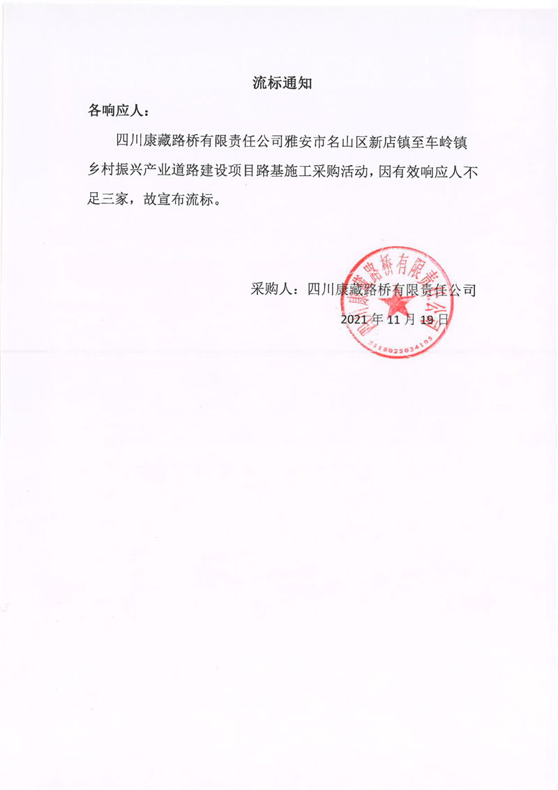 四川康藏路橋有限責(zé)任公司雅安市名山區(qū)新店鎮(zhèn)至車(chē)嶺鎮(zhèn)鄉(xiāng)村振興產(chǎn)業(yè)道路建設(shè)項(xiàng)目路面施工采購(gòu)流標(biāo)通知