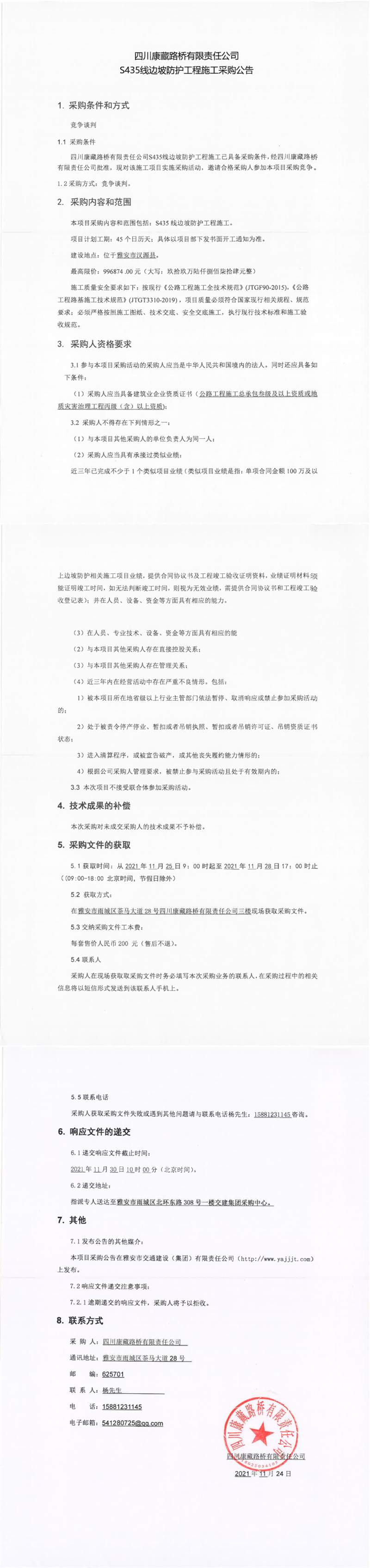 四川康藏路橋有限責任公司S435線邊坡防護工程施工采購公告