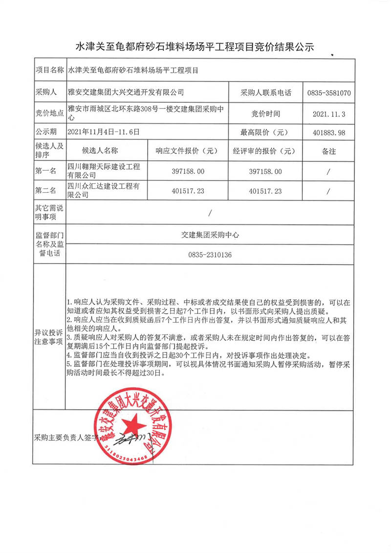 雅安交建集團大興交通開發(fā)有限公司水津關(guān)至龜都府砂石堆料場場平工程項目競價結(jié)果公示