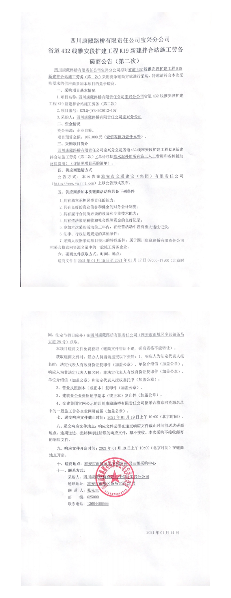 四川康藏路橋有限責(zé)任公司寶興分公司省道432線雅安段擴(kuò)建工程K19新建拌合站施工勞務(wù)磋商公告(第二次)