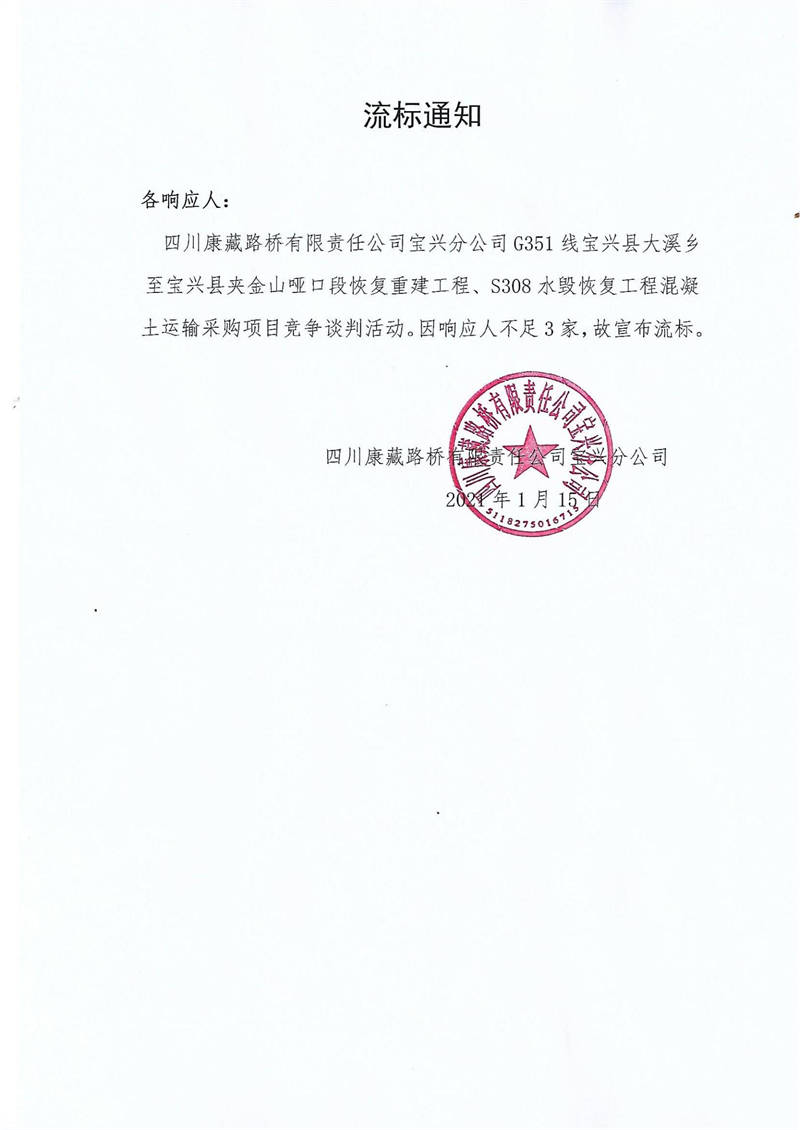 四川康藏路橋有限責(zé)任公司寶興分公司G351線寶興縣大溪鄉(xiāng)至寶興縣夾金山啞口段恢復(fù)重建工程、S308水毀恢復(fù)工程混凝土運(yùn)輸采購項目流標(biāo)通知
