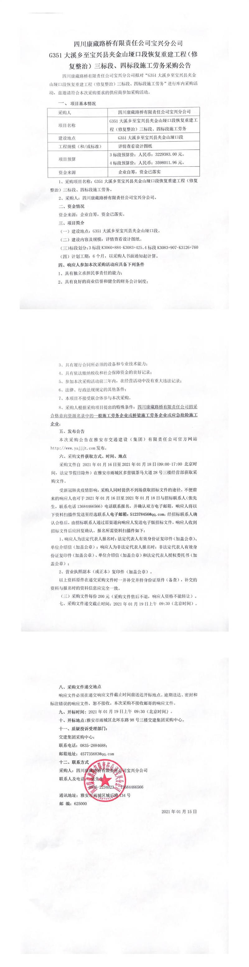 四川康藏路橋有限責任公司寶興分公司G351線寶興縣大溪鄉(xiāng)至寶興縣夾金山埡口段恢復重建工程(修復整治)三標段、四標段施工勞務(wù)采購公告