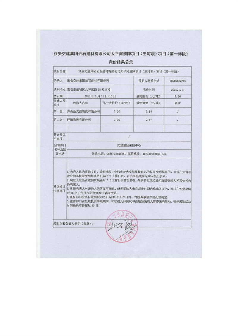 雅安交建集團云石建材有限公司太平河清障項目(王河壩)項目(第一標段)競價結(jié)果公示