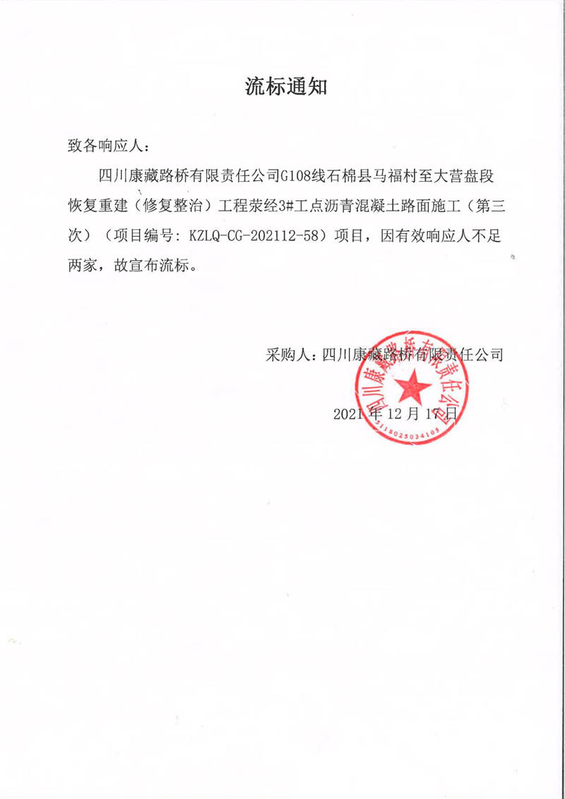 四川康藏路橋有限責(zé)任公司G108線石棉縣馬福村至大營(yíng)盤段恢復(fù)重建(修復(fù)整治)工程滎經(jīng)3#工點(diǎn)瀝青混凝土路面施工(第三次)流標(biāo)通知