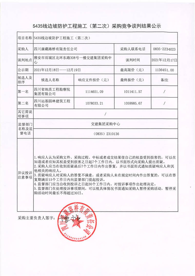 四川康藏路橋有限責(zé)任公司S435線(xiàn)邊坡防護(hù)工程施工(第二次)采購(gòu)競(jìng)爭(zhēng)談判結(jié)果公示