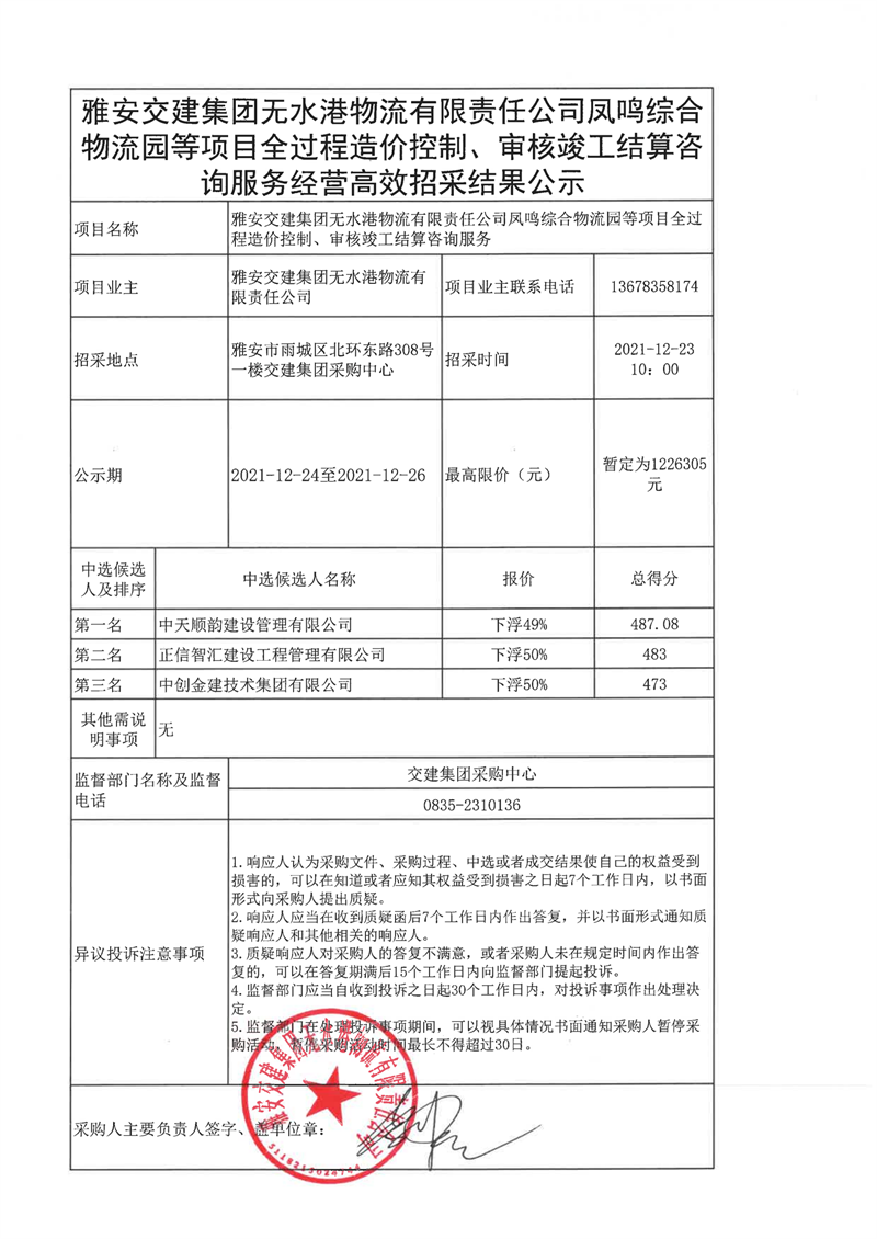雅安交建集團(tuán)無水港物流有限責(zé)任公司鳳鳴綜合物流等項(xiàng)目全過程造價(jià)控制、審核竣工結(jié)算咨詢服務(wù)經(jīng)營(yíng)高效招采結(jié)果公示
