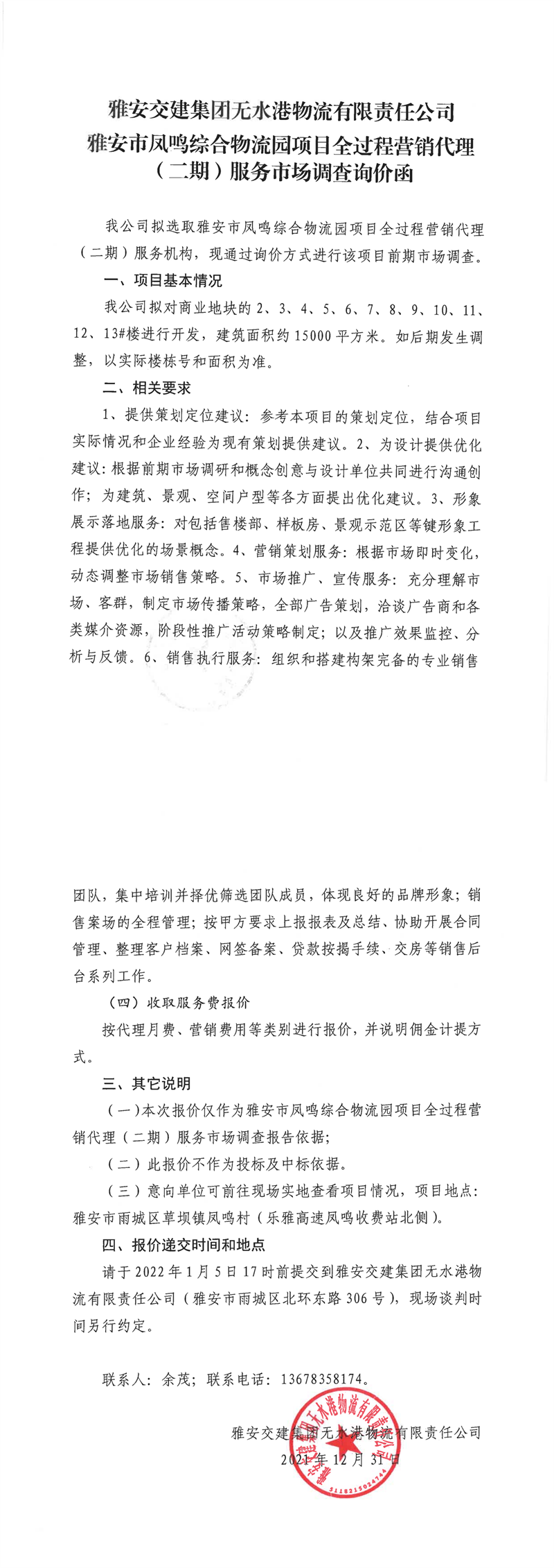 雅安交建集團無水港物流有限責任公司雅安市鳳鳴綜合物流園項目全過程營銷代理(二期)服務市場調查詢價函