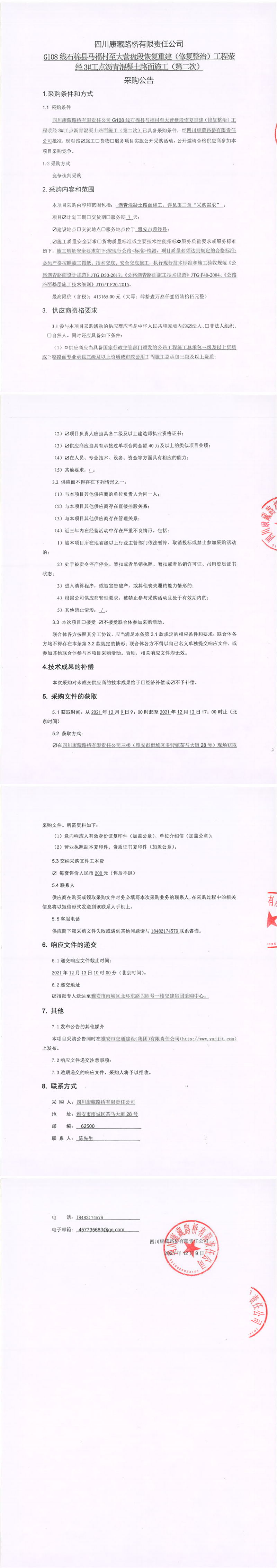 四川康藏路橋有限責任公司G108線石棉縣馬福村至大營盤段恢復重建(修復整治)工程滎經3#工點瀝青混凝土路面施工(第二次)采購公告