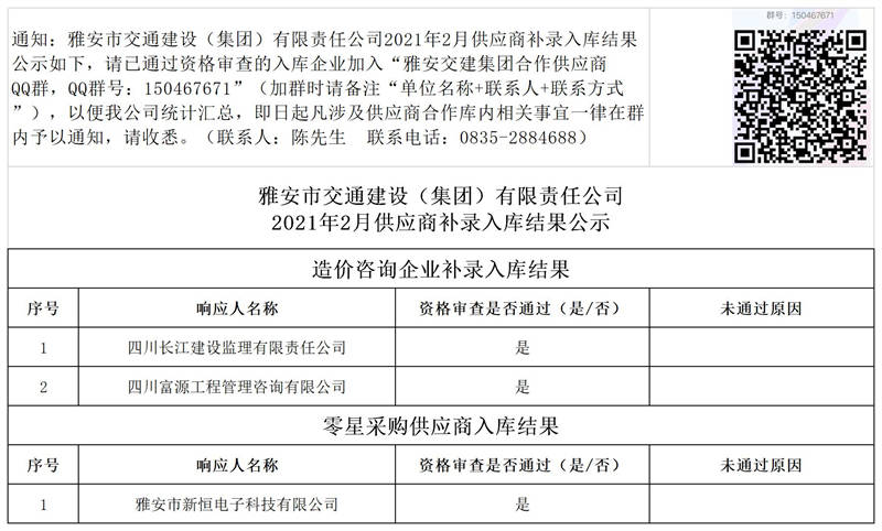 雅安市交通建設(集團)有限責任公司2021年2月供應商補錄入庫結(jié)果公示