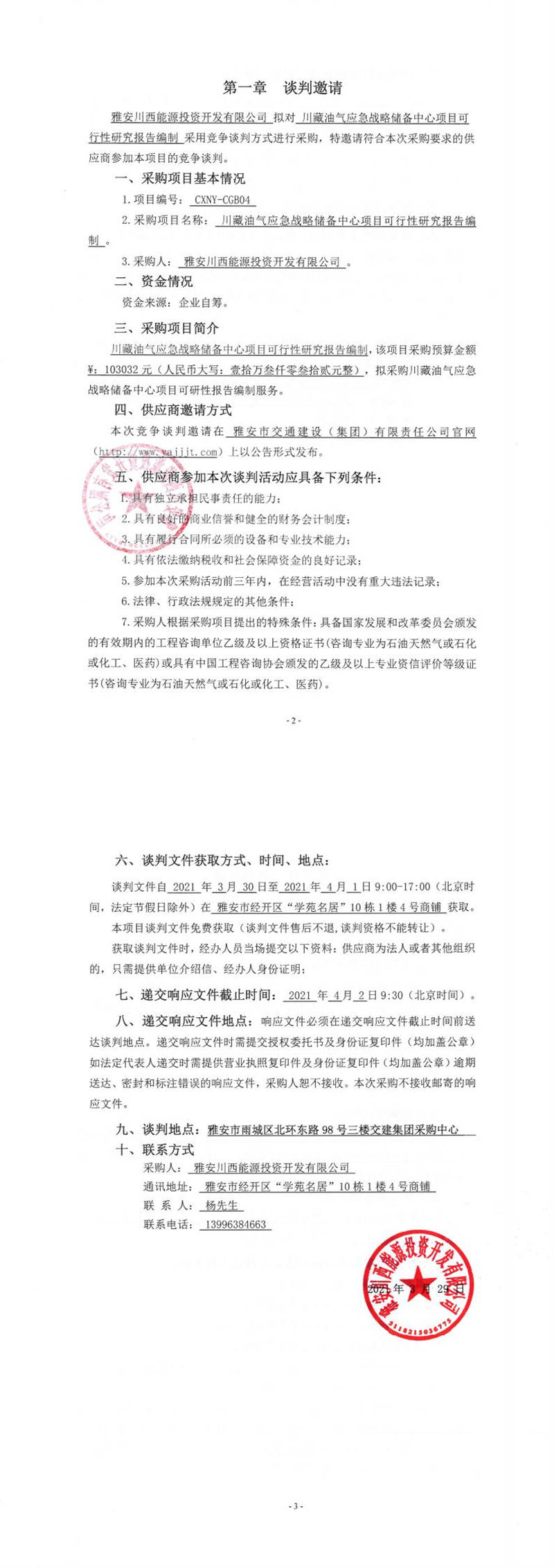 雅安川西能源投資開發(fā)有限公司川藏油氣應(yīng)急戰(zhàn)略儲備中心項目可行性研究報告編制競爭談判公告
