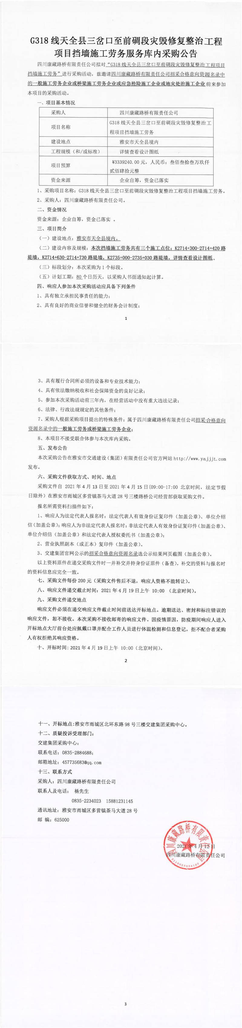 四川康藏路橋有限責(zé)任公司G318線天全縣三岔口至前碉段災(zāi)毀修復(fù)整治工程項目擋墻施工勞務(wù)服務(wù)庫內(nèi)采購公告