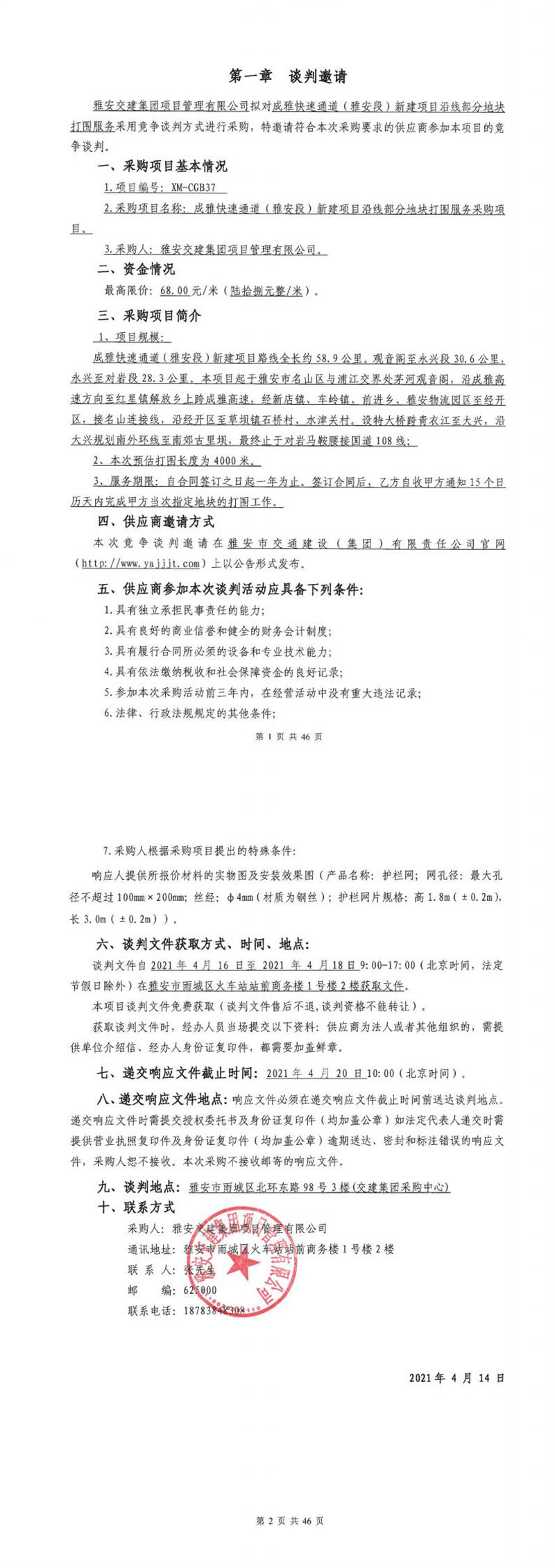雅安交建集團(tuán)項(xiàng)目管理有限公司成雅快速通道(雅安段)新建項(xiàng)目沿線部分地塊打圍服務(wù)采購項(xiàng)目競(jìng)爭(zhēng)談判公告