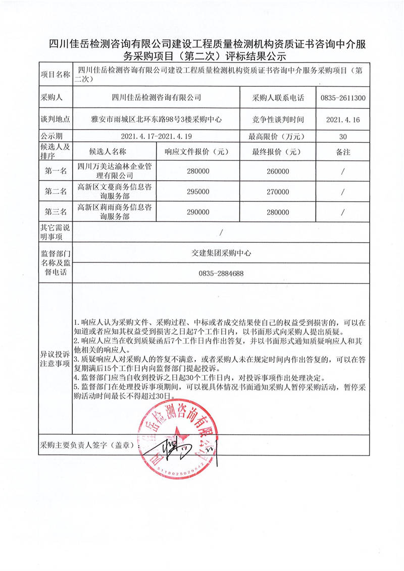 四川佳岳檢測咨詢有限公司建設工程質(zhì)量檢測機構(gòu)資質(zhì)證書咨詢中介服務采購項目(第二次)評標結(jié)果公示