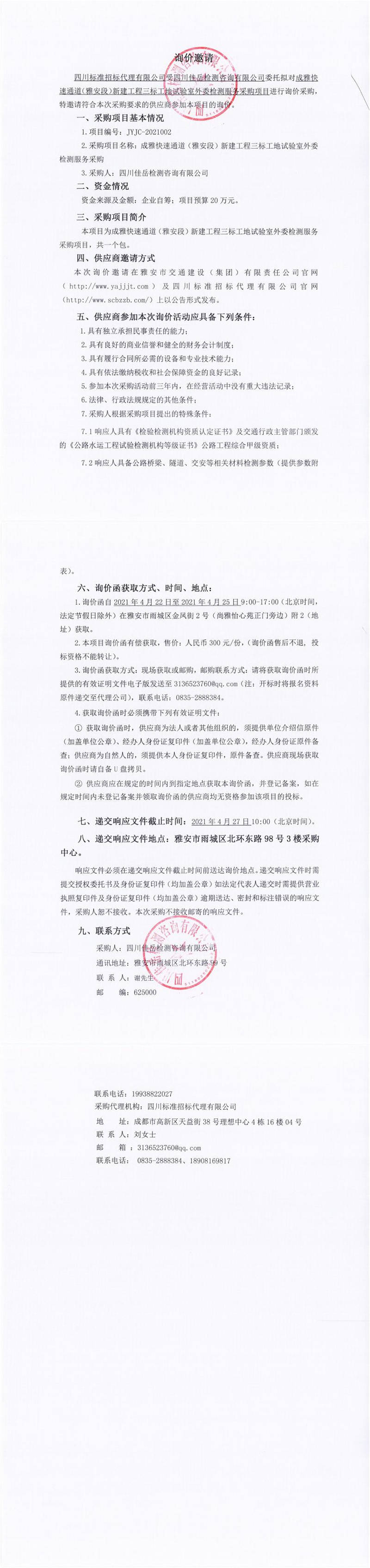 四川佳岳檢測咨詢有限公司成雅快速通道(雅安段)新建工程三標(biāo)工地試驗(yàn)室外委檢測服務(wù)采購詢價公告