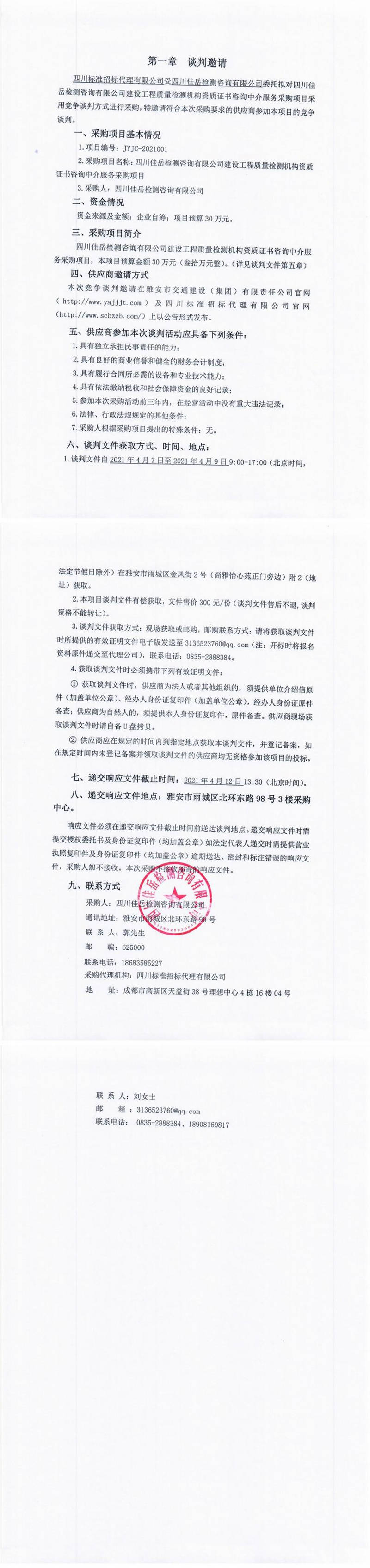 四川佳岳檢測咨詢有限公司建設工程質量檢測機構資質證書咨詢中介服務采購項目競爭談判公告