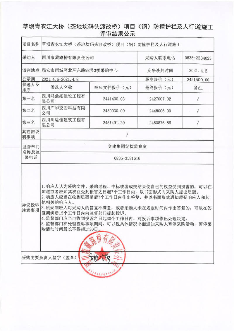 四川康藏路橋有限責(zé)任公司草壩青衣江大橋(茶地坎碼頭渡改橋)項目(鋼)防撞護(hù)欄及人行道施工評審結(jié)果公示