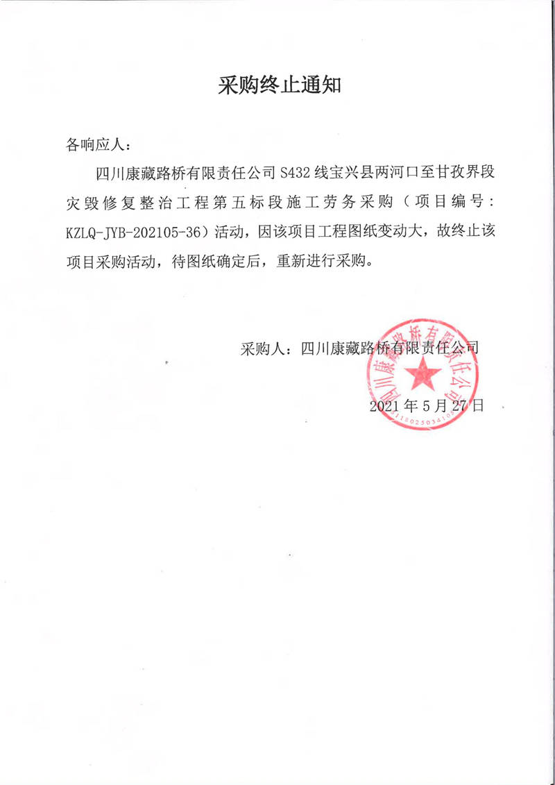 四川康藏路橋有限責(zé)任公司S432線(xiàn)寶興縣兩河口至甘孜界段災(zāi)毀修復(fù)整治工程第五標(biāo)段施工勞務(wù)采購(gòu)終止通知