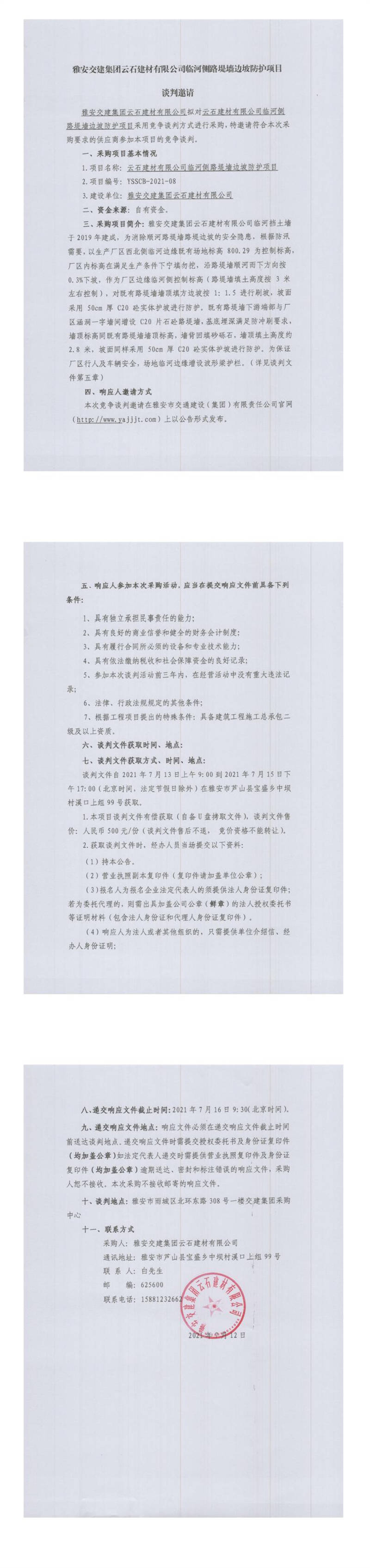 雅安交建集團(tuán)云石建材有限公司臨河側(cè)路堤墻邊坡防護(hù)項(xiàng)目競(jìng)爭(zhēng)談判公告