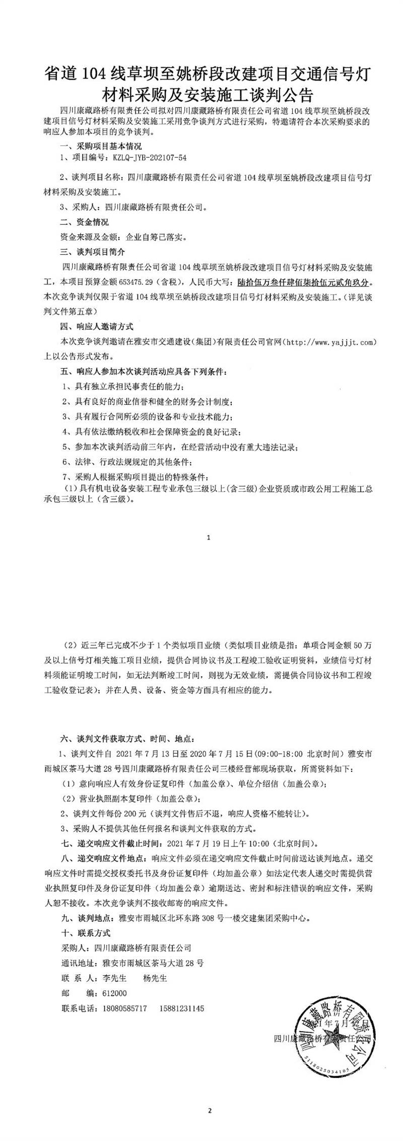 四川康藏路橋有限責(zé)任公司省道104線草壩至姚橋段改建項目交通信號燈材料采購及安裝施工競爭談判公告