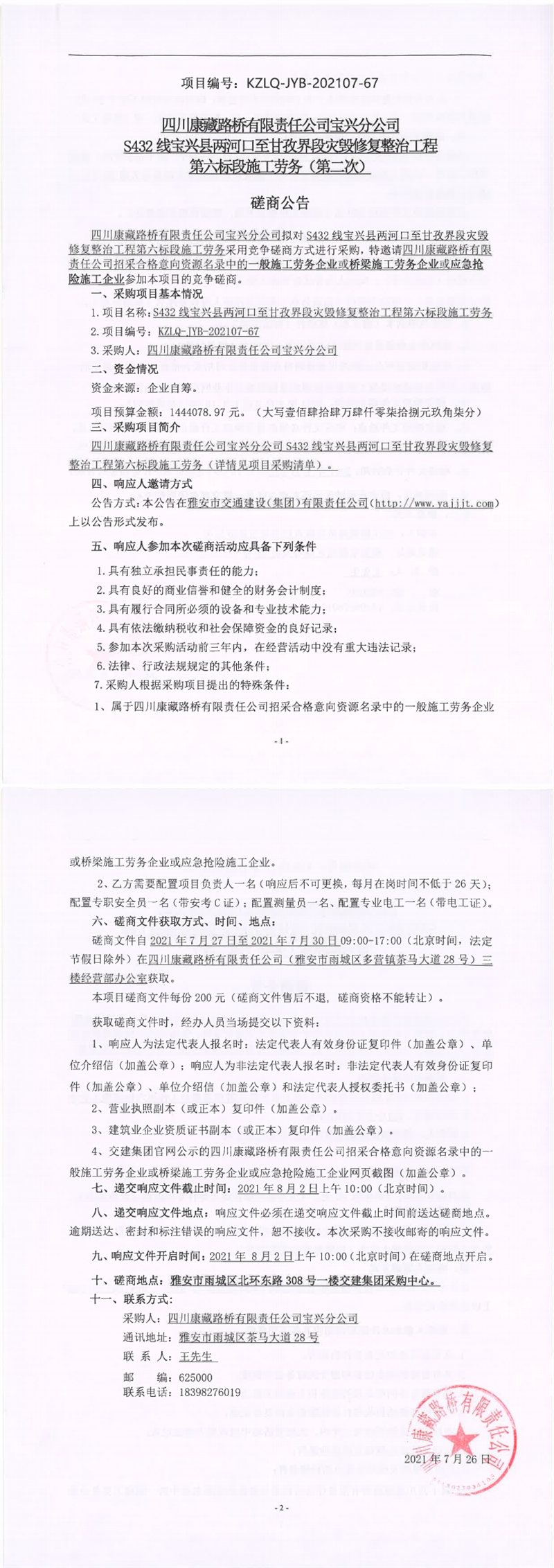四川康藏路橋有限責任公司S432線寶興縣兩河口至甘孜界段災毀修復整治工程第六標段施工勞務(第二次)競爭磋商公告