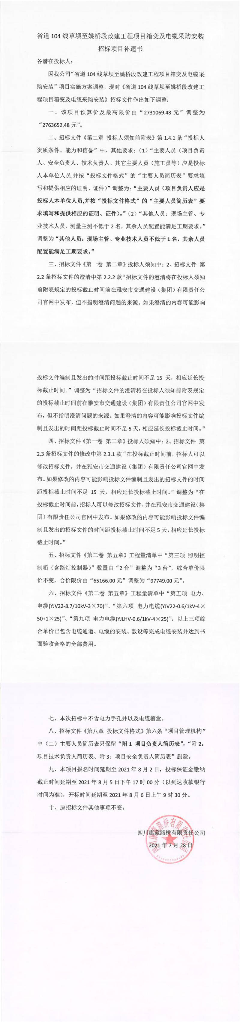 四川康藏路橋有限責(zé)任公司省道104線草壩至姚橋段改建項(xiàng)目箱變及電纜采購(gòu)安裝招標(biāo)項(xiàng)目補(bǔ)遺書